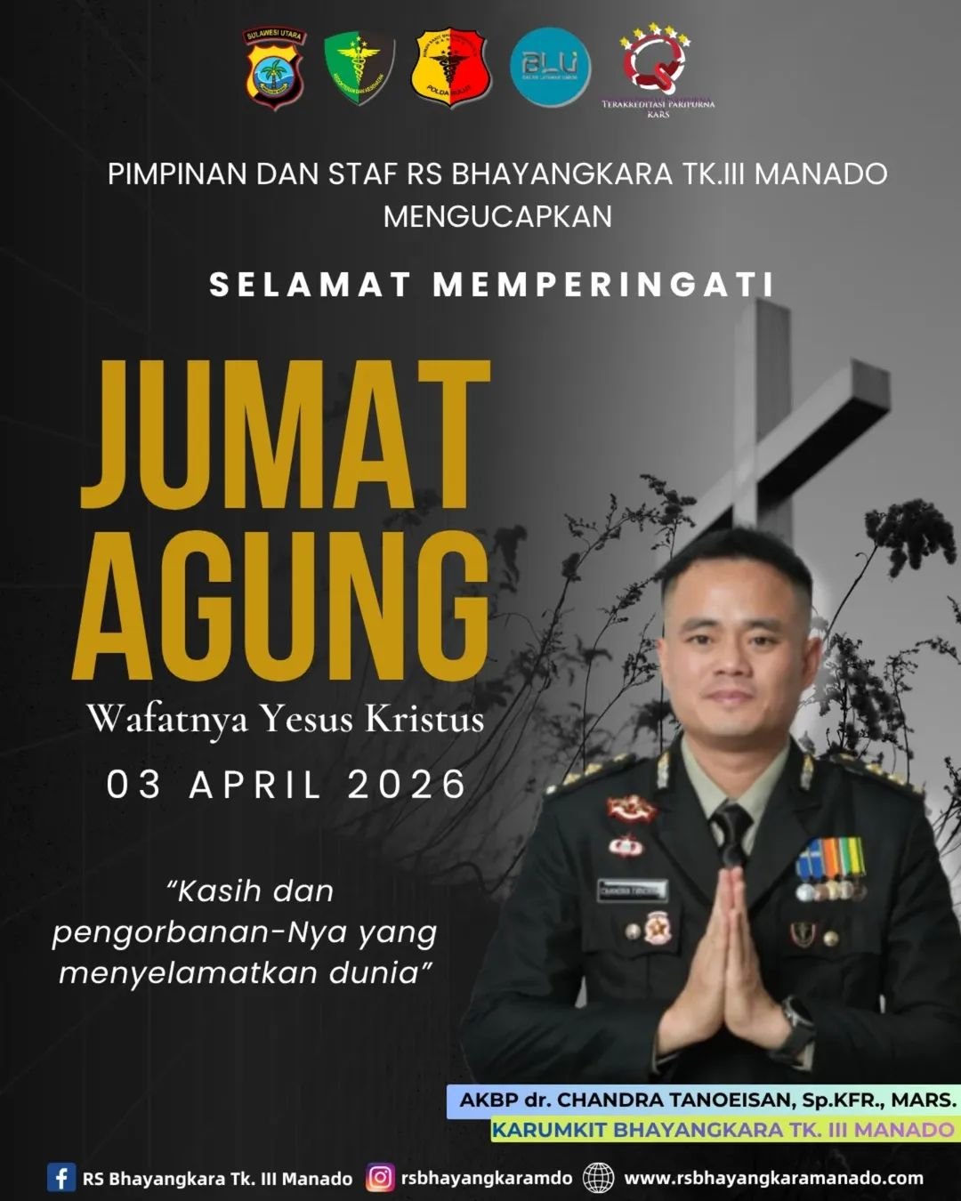 Dalam momentum tersebut, Karumkit RS Bhayangkara Tk. III Manado, AKBP dr. Chandra Tanoeisan, SP.KFR., MARS., bersama jajaran menyampaikan ucapan, “Selamat memperingati Jumat Agung wafatnya Yesus Kristus. Kasih dan pengorbanan-Nya yang menyelamatkan dunia.”